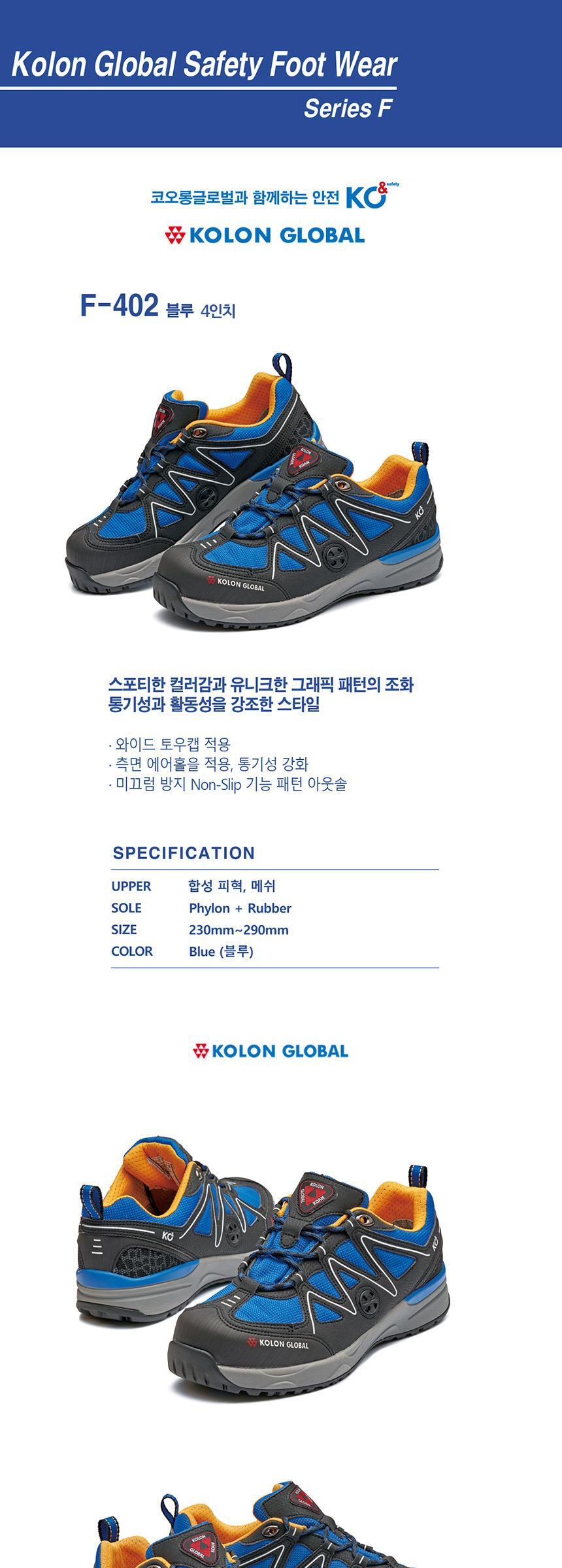 코오롱글로벌 발편한 통풍 논슬립 캐주얼 4인치 작업화 안전화 F-402 (BL)
